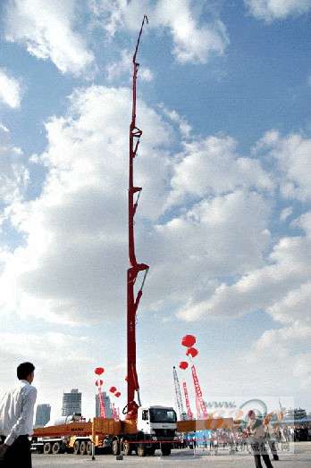 在东方明珠、经贸大厦、上海环球金融中心的包围和映衬下,一支红色机械巨臂向天空无限延伸,似要与周围的楼宇赛高——这支巨臂就是刚刚获得世界吉尼斯桂冠的三一66米泵车的臂架。