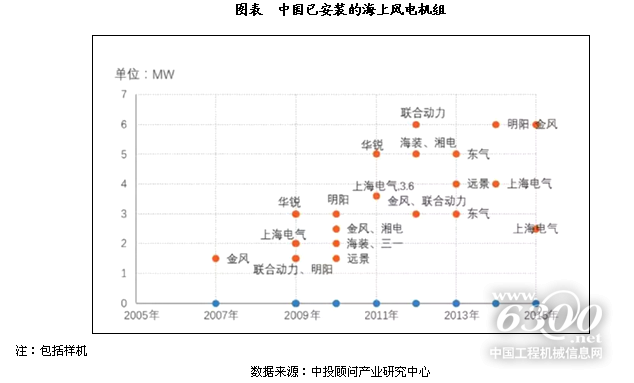 中投顾问发布的《2016-2020年中国海上风力发电行业投资分析及前景预测报告》显示,截至2015年底,在所有吊装的海上风电机组中,单机容量为 4MW机组最多,累计装机容量达到352MW,占海上装机容量的34.69%,其次是2.5MW机组,装机容量占18.48%,3MW装机容量占比为 17.74%,其余不同功率风电机组装机容量占比均不到10%。目前单机容量最大的是6MW机组,除了原有联合动力和明阳风电的产品,金风科技在2015 年新增吊装一台6MW机组。