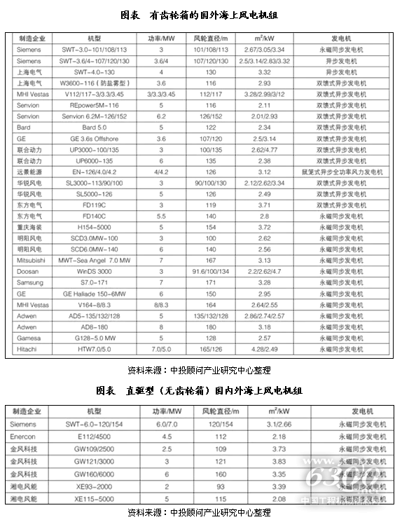 国外的海上风电机组,可看出大功率风电机组增多,如:6MW、7MW和8MW等,且均已经进入商业化运营阶段,10MW风电机组也有了实验样机。从已经安装的海上风电机组看,同样传动系统为带齿轮箱的占多数,直驱较少。由此可见,大功率海上风电机组是趋势,而中国的海上风电机组究其如何发展,让我们拭目以待。