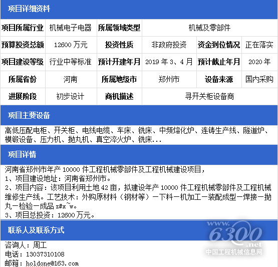项目名称:河南省郑州市年产10000件工程机械零部件及工程机械建设项目