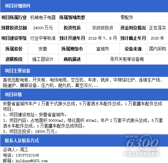 项目名称:安徽省宣城市年产2万套干式接头总成,5万套洒水车配件总成,1万套罐车配件总成项目