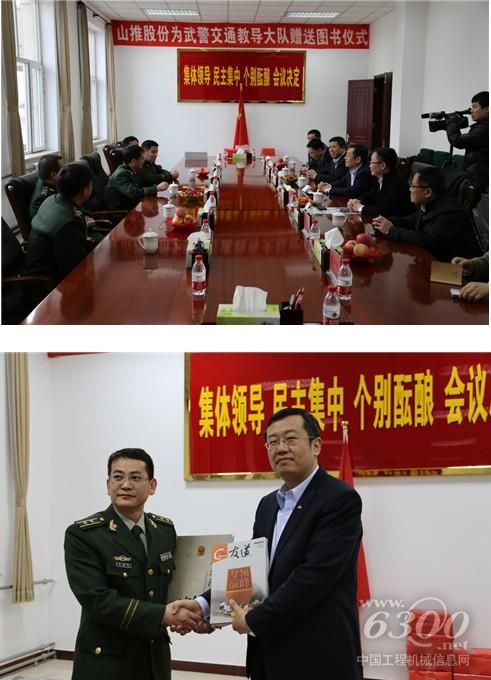 新年伊始,山推股份公司向武警交通部队赠书图书仪式在武警交通部队指挥部教导大队会议室举行。武警教导大队政委訾灿亭、副大队长何光明、训练处长尹德强、政治处主任杜文江、队伍处处长聂桂平,工程机械协会路面机械分会副秘书长雒泽华,公司国内营销事业部负责人参加了此次赠书仪式。