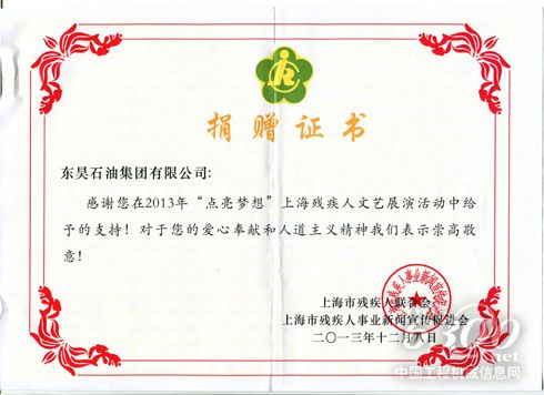 近日,上海市残疾人联合会向在演出活动中奉献过自身力量的东昊石油集团送来了捐赠证书,感谢东昊石油在本次活动中的大力支持。