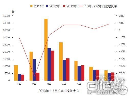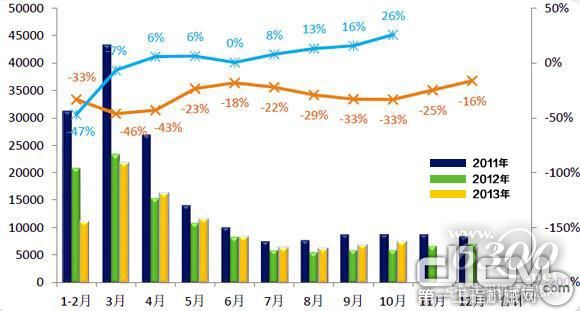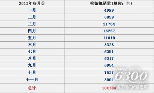根据中国工程机械工业协会公开的数据,第一工程机械网记者对2013年1—11月挖掘机销售数量以图表的形式做了统计,读图可以看出市场对于挖掘机的需求与国家政策变化紧密相关。2013年初,受寒冷天气的影响,各地多数项目进入休工期,一月份和二月份挖机销量低于预期。春节过后,随着三月份“两会”的召开,以及各种工程项目开工,挖机的销量再度攀升,其中3月份挖掘机销量高于1、2月份销量总和,小型挖掘机销量占到总销量将近50%。到了七八月份,工程机械行业进入整体淡季,挖机销量再度降低。临近岁终年末,挖机的销量又随着国家相关利好政策的出台而逐步攀升。