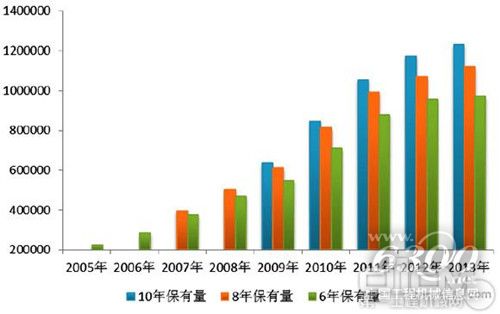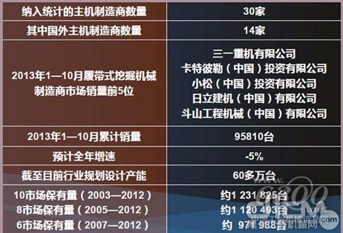 挖掘机械分会调研数据表明,截止2013年9月,在中国生产挖掘机械的企业有60多家,纳入分会统计的为30家,规划产能约60多万台,代理商约200多家,共生产和销售约500种不同型号和规格的挖掘机械产品,单台整机重量为1—804t,预计2013全年市场销量11万台,较2012年下降5%。截止2013年9月,经分会调查统计,中国挖掘机械市场10年市场保有量约为1231825台,8年市场保有量约为1120493台,6年市场保有量约为971988台。
