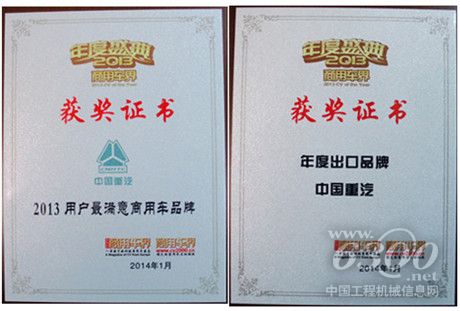 2014年1月11日,由《商用车界》杂志主办,交通运输部、中国汽车技术中心、同济大学、长安大学、中国物流与采购联合会、中国汽车工业协会、国家信息中心等单位协办的“2013商用车界年度盛典”在北京隆重举行。中国重汽获年度用户最满意商用车品牌,同时还被评为“2013年度出口品牌”。