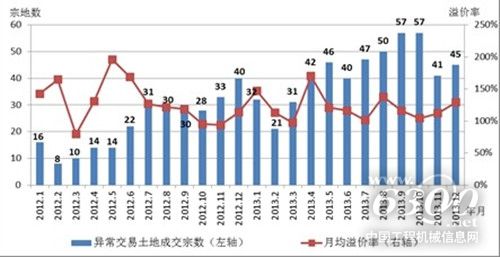 截至2013年12月30日,四季度上报成交异常交易地块143宗,较上一季度减少了3宗;较去年同期增加了42宗,涨幅为42%。其中一线城市15宗,二线城市26宗,三四线城市数量较多,达102宗,超过总数的七成。平均溢价率为122%,比上季度上升了4个百分点,与上年同月期相比,上升了13个百分点。平均竞价轮次为73次,较上一季度减少10次,较去年同期增加22次。总体看来,四季度成交的异常地块中数量略有下降,但平均溢价率和平均竞价轮次有所上升,三、四线城市占比明显增加,一、二线城市多数地块成交相对理性。