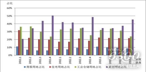(三)主要监测城市土地供应量明显增加,环比、同比大幅上涨,房地产用地供应达到历年单季度最高值,交通、水利基础设施等其他用地供应占比增加