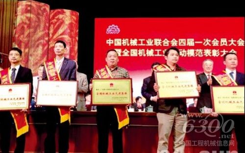 3月26日,由国务院人力资源和社会保障部、中国机械工业联合会共同举办的全国机械工业先进集体、劳动模范和先进工作者表彰大会在北京隆重举行。股份公司荣获“全国机械工业先进集体”称号,装载机公司生产服务中心磨具班班长扈海安荣获“全国机械工业劳动模范”称号。全国人大常委会副委员长路甬祥,全国人大副委员长顾秀莲等领导在会上为获奖代表颁奖。公司党委副书记、纪委书记、工会主席王相民代表公司接受颁奖(如下图左三)。