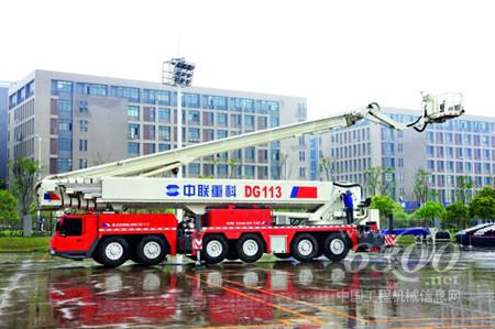 中联重科DG113登高平台消防车集巨型登高平台消防车、举高喷射消防车、泡沫消防车三者功能于一身,登高平台最大作业高度达到113米,适用于35层以上高层、超高层大型建筑的救援、消防灭火和高空作业,具备多项优越性能: