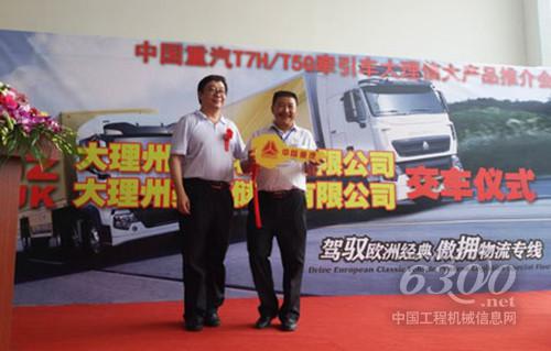 7月1日,中国重汽销售部昆明分公司在云南省大理隆重举行云南省首批T5G牵引车及部分T7H的交车仪式。中国重汽集团常务副总经理王浩涛和云南信大集团董事长郑元初、购车单位大理滇储物流公司总经理杨贵平、大理美登储运总经理杨靖、大理各物流公司领导及100多名用户参加了此次交车仪式。