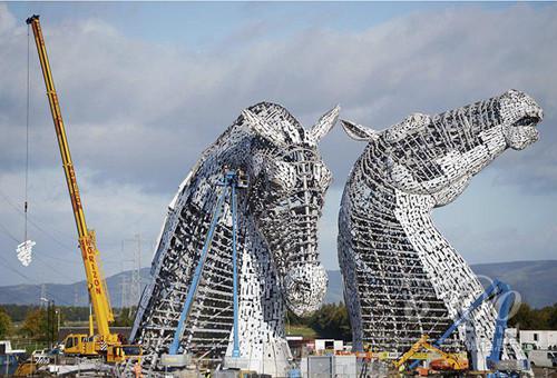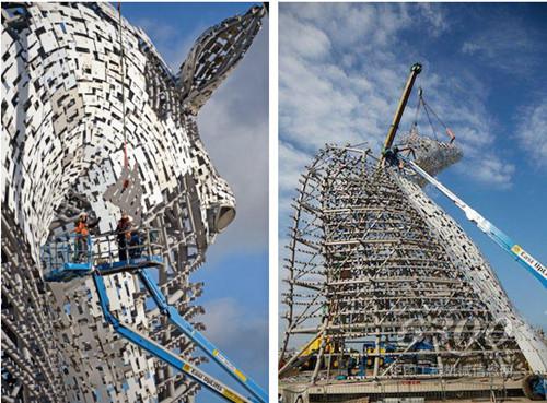 八台吉尼高空作业平台从Easi Uplifts的格拉斯哥仓库发出,在两个重达160吨的马头形钢结构建筑的施工中完成了大量工作。钢结构外面要覆盖468块形状各异的重型不锈钢板,工作精度要求高,然而工期仅为五个月。雕塑的两个巨型马头中间有水道通行,这使得该项目更具挑战性。