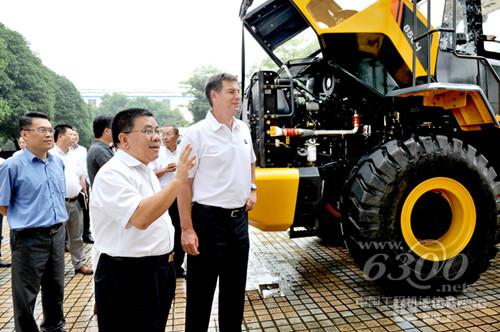 停放在大楼前的一台CLG856H装载机和一台CLG856CN装载机的动力部份,是公司与康明斯合作的成果。在作了简单情况介绍后,曾光安转身向冯天祥介绍了这两款产品。当得知这两款产品搭载的是双方合资组建广西康明斯动力有限公司生产的发动机时,冯天祥立即移步到CLG856H装载机的尾部,仔细观看已打开发动机罩的发动机部份。在曾光安总裁的建议下,冯天祥快速登上驾驶室并发动机器进行了体验,他不时竖起大拇指,嘴上说着:“Good! Good!(好!好!)”他对双方真诚的合作并在短时间里取得令人喜悦的成果感到高兴。
