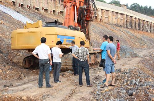 我们回访小组来到工地上,"JOVE“旋挖钻机就停在半山腰上,山下就是食品厂厂房。为了防止山体滑坡,必须要建设一百多根护坡桩来牢牢的护卫山体。从山下望去,280D显得特别高大,稳稳的屹立在山坡上。刚完成了两根桩的施工作业。我爬上山来,察看了两根桩孔,成桩漂亮,桩孔非常整齐,桩底捞渣干净。现场设备负责人向我们介绍,此台设备让他最省心,没出任何毛病,相比原来某厂家的旋挖,它更省油,施工效率更高,省时,在前一项目时赢得了工期。而且它进口的底盘,稳定性好。在这山坡上施工,放心。