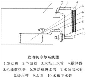 检查发动机机油,油尺显示油位正常;拆下气门室罩盖,发现缸盖上面有少量白色泡沫。放水检查,发现液质浑浊、无油渍。ZL50型装载机配置的是上柴615型发动机,其冷却系统如附图所示。