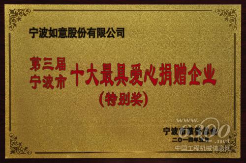 近日,宁波市慈善总会授予宁波如意“市十大最具爱心捐赠企业”特别奖。