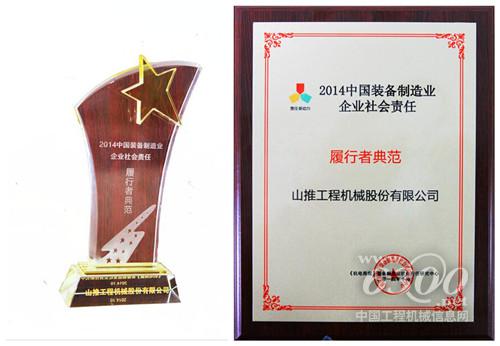 峰会期间,与会各方共同见证了《中国装备制造业企业社会责任指南》编制启动仪式。在这次峰会上,山推以“价值”为核心,“创新”求突变,全面提升责任竞争力体系,依托“内生式增长”肩负 “国之重器”的责任与使命,荣膺“2014中国装备制造业企业社会责任履行者典范”称号;同时《山推:责任转型,价值共享》入选《2014中国装备制造业企业社会责任报告》。