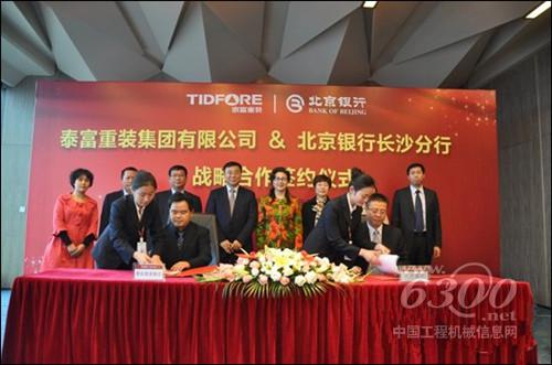 10月31日下午,泰富重装集团有限公司与北京银行长沙分行战略合作签字仪式在泰富九华生产基地举行。泰富重装集团董事长张勇、北京银行长沙分行行长安文梅出席签约仪式。签约仪式由泰富重装集团党委副书记、副总裁游志远主持,泰富重装集团副总裁兼财务总部总经理彭铸与北京银行长沙分行副行长戴炜分别代表双方签署《战略合作协议》。