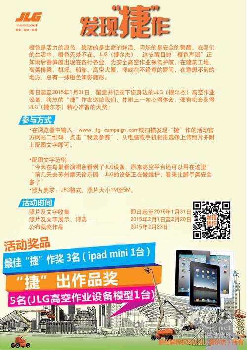 此次JLG举办的“发现‘捷’作”活动,不仅是为了让现有的客户了解JLG设备广泛的应用领域,更是为了普及公众对于高空作业的认识,高空作业安全看似遥远,其实一直在你身边,希望大家与JLG一道共同推动中国高空作业的持续发展,为高空施工安全添砖加瓦。JLG“发现‘捷’作”活动为期三个月,历经照片收集、展示、评选,最终选出三名最佳“捷”作奖,及五名“捷”出作品奖,并获得JLG为您精心准备的丰富奖品。