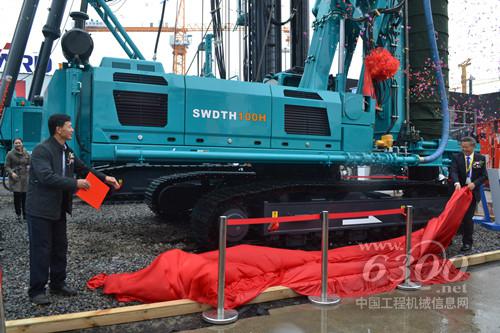 此次展会上,山河智能举办了SWDTH100H大直径潜孔锤钻机新品发布会,11月25日上午,在上海新国际会展中心E60山河智能展区,一片热闹非凡的景象,山河智能自主研发生产的SWDTH100H大直径潜孔锤钻机新品发布会在此隆重举行。中国工程机械桩工机械分会副会长郭传新、山河智能装备集团董事长何清华出席了此次新品发布会,山河智能装备集团常务副总经理陈刚主持了此次新品发布会,大直径潜孔锤钻机是山河智能2014年研发制造的“新”品,该产品主要解决了大直径、深孔“高效入岩”的技术难题,是一种新型环保的机械设备。该产品打破传统的基础施工难点,不管是高效钻进、直孔钻进、深孔钻进,都不会产生漏气、超钻现象,完全避免了对周围结构的损害,并可以在敏感地层中完成具挑战性的基础工程项目,该钻机动力头扭矩大、可实现前倾和侧移功能,成孔直径大,可达1016mm,成孔深度80m。该设备最主要的优势,能实现依据钻杆套管的重量来调整主卷扬的提升力,保证潜孔锤所需的最合适的加压力。在驾驶室内可调节潜孔锤的风量和风压,并可控制潜孔锤的润滑开关和油量大小,以及水泵的开关,可钻进沙土、粘土、卵石、砾石、熔洞、漂石和岩石层等复杂地质,广泛应用于道路、桥梁、码头、高层建筑等地基基础工程施工。