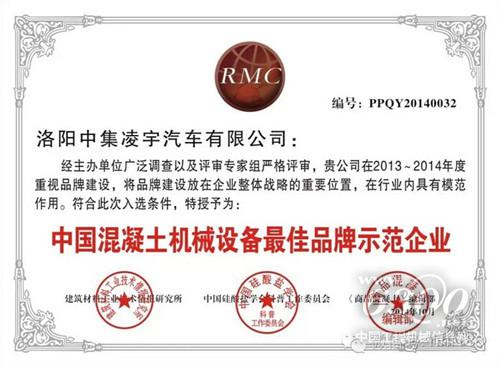 中集凌宇汽车有限公司荣获2013-2014年度混凝土机械设备最佳品牌示范企业