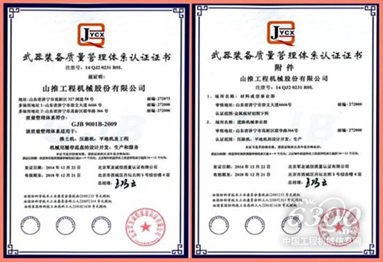 近日,山推取得了北京军友诚信质量认证有限公司颁发的武器装备质量管理体系认证证书。该证书适用范围是公司的推土机、压路机、平地机及工程机械用履带底盘的设计开发、生产和服务。
