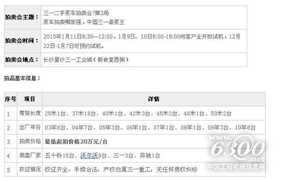 据中国工程机械信息网小编了解,三一二手泵车拍卖会第2场将于2015年1月11日在湖南长沙三一工业城举行。