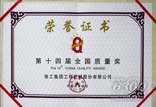 2014年,徐工集团工程机械股份有限公司荣获我国质量管理领域的最高荣誉——“全国质量奖”。全国质量奖是与全球知名的美国波多里奇奖、欧洲质量奖、日本戴明奖齐名的世界级质量管理奖。公司董事长、党委书记王民荣获“中国杰出质量人”奖。12月,公司《大型制造企业集团全价值链协同的信息化提升管理》荣获第二十一届全国企业管理现代化创新成果一等奖,这是全国企业管理创新成果的最高奖。