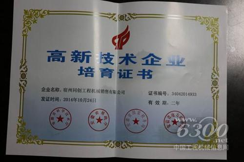 安徽宿州同创工程机械销售有限公司成为政府重点培育高新技术企业