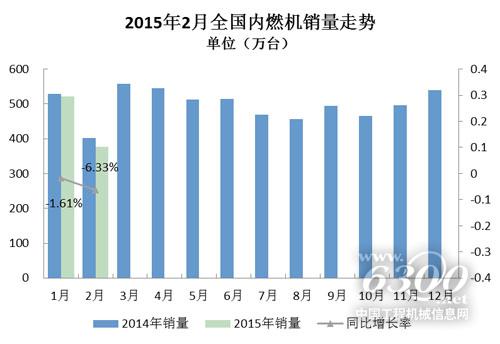 根据中国内燃机工业协会《中国内燃机工业销售月报》重点企业数据显示,2015年2月完成内燃机销量 377.43万台,环比下降27.56%,同比下降6.33%,同比累计下降3.46%;2月完成13897.30万千瓦,环比下降29.63%,同比下降9.25%,同比累计增长0.47%。乘用车市场仍好于行业平均水平,同比累计增长7.46%;园林机械市场同样表现优异,同比增长20.14%同比累计增长1.06%;而柴油机市场总体状况未有改观,同比累计降幅达到了24.16%。