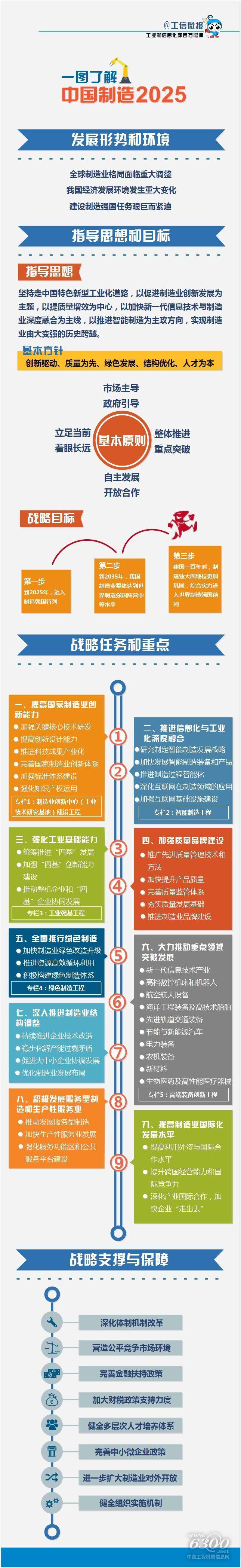 为确保完成目标任务,《中国制造2025》提出了深化体制机制改革、营造公平竞争市场环境、完善金融扶持政策、加大财税政策支持力度、健全多层次人才培养体系、完善中小微企业政策、进一步扩大制造业对外开放、健全组织实施机制等8个方面的战略支撑和保障。