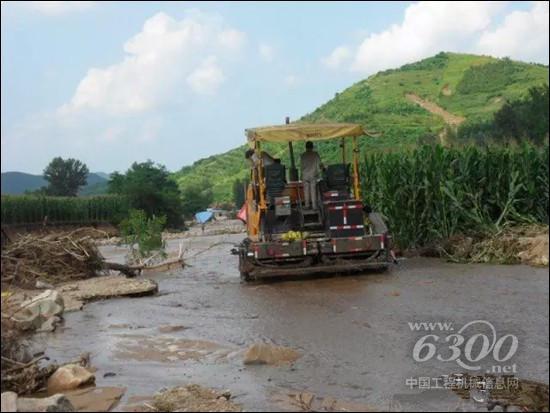施工地点在辽阳市吉洞镇山区,道路崎岖,到处都是被洪水冲出来的河道、被淹没的农田,还有倒塌的房屋。车辆行驶在临时用砂石铺垫的小路上,随时都有被冲下小路的危险。因为山洪将山路淹没,服务车辆无法开进施工地点,曾玉林只能站在装载机上,朝摊铺机驻地方向前进。行驶了大概10分钟,就看到三一的摊铺机停在“河道”中央,浸泡在水里,而旁边另一国产品牌的压路机只能看见驾驶室了。曾玉林赶紧上前查看设备情况,只见摊铺机一边履带被埋在泥石里面,设备已倾斜,状况很不乐观。