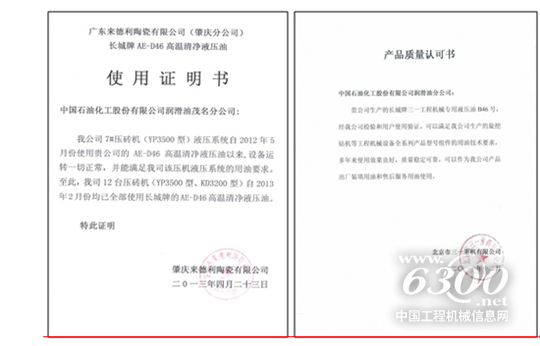 凭借多种产品选择和优异的性能表现,长城润滑油的高端系列AE液压油得到来自业内人士及客户的广泛好评。天津钢管制造有限公司的套管线上料液压站就对长城润滑油的AE32液压油的综合性能给予高度肯定,该液压站使用AE 32液压油采用整体切换的方式替代了原液压油,设备运行状态非常顺畅,效果令人满意。作为佛山陶瓷行业中具有影响力的陶瓷厂商,广东来德利陶瓷有限公司也对长城的AE液压油赞赏有加, AE-D46高温清净液压油自2012年在该公司液压系统进行开始试用以来,设备运转一切正常,完全满足该压砖机液压系统的用油要求,目前该公司12台压砖机全部使用长城AE-D46高温清净液压油。此外,AE46液压油自2009年起还用于三一重工SR系列旋挖钻机,三一重工对该产品的使用效果非常满意,其性能可充分满足了该公司产品的使用要求,该产品于2011年底,获得该液压油在三一重工旋挖钻机系列产品上应用的质量认可。