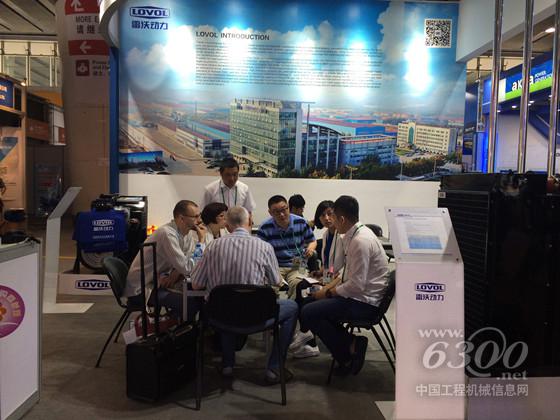 图为正在雷沃动力展位洽谈业务的中外用户。