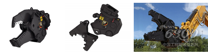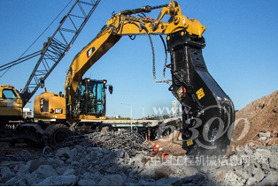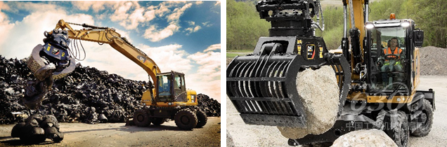 以较为普遍的楼房拆迁为例,目前较为常见的做法是直接用铲斗或破碎锤将承重墙或混凝土框架破坏,使楼房倒塌。采用这种做法虽然简单直接,但是会产生很多粉尘,污染周边环境,而且危险性较高。Cat专门为轮式挖掘机的这一工况配置了专业的液压剪,液压粉碎机,多功能处理机,拆解抓斗,工程抓斗。在拆楼房的过程中可以先将大块物料从建筑上拆下,然后再进行细分。专业的液压剪带来了三方面的优势,一是减少了灰尘对环境的污染,二是降低了危险性,三是有利于物料的回收和再利用。