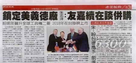友嘉日前并购才传喜讯,成功并购德国MAG集团工业自动化系统事业,及瑞士知名多轴加工机龙头厂Pfiffner ,友嘉集团全球自动化生产设备商地位由全球前十大,已经跃升为全球第三大,仅次于DMG、MAZAK的切削工具机业者,完成MAG及Pfiffner整合后,年营收估计增加约230亿台币。