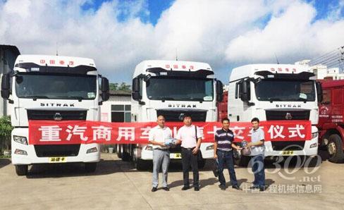 近日,中国重汽商用车销售部云桂大区与经销单位在广西绿城南宁将三台汕德卡牵引车交付某集团大客户。该单位前期已购买两台汕德卡搅拌车。