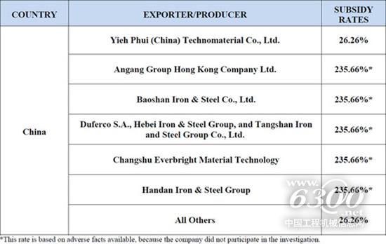 美国商务部在通过电子邮件发送的公告中表示,商务部初步调查发现包括鞍钢集团香港有限公司、宝钢、河北钢铁集团、常熟科弘材料科技、邯郸钢铁这五家中国出口商所获得的补贴比例高达上述水平。美国海关边境保护局将按照指示根据这些公司所获补贴比例来要求它们缴纳现金保证金。
