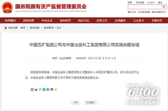 新华社从国资委获悉,中国冶金科工集团有限公司整体并入中国五矿集团公司,成为其全资子企业。中国冶金科工集团有限公司不再作为国资委直接监管企业。