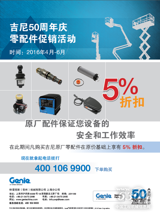 吉尼零配件服务团队悉心周到的服务支持,也正体现了吉尼“以客户为中心”的服务理念。在2016年品牌成立50周年之际,吉尼为回馈广大客户的信任和支持还特别推出了“吉尼50周年庆零配件促销活动”。凡在4月到6月的活动期间购买吉尼原厂零配件的客户,即可在原价基础上享有 5% 折扣。吉尼将在下一个50周年继续以客户的利益为出发点,以高品质的产品和周到的服务引领高空作业平台行业的发展。