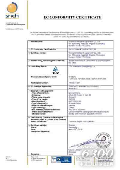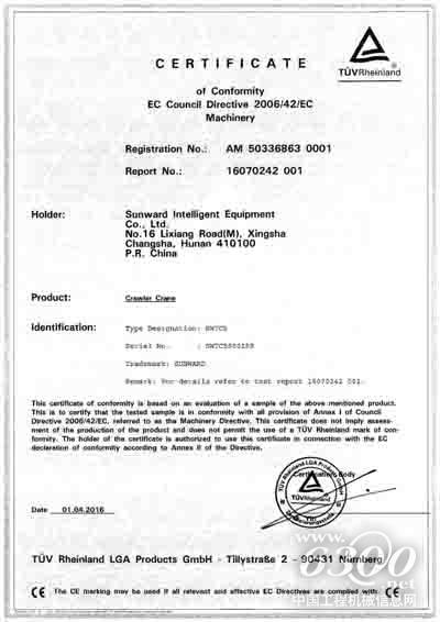 2016年4月,山河智能SWTC5伸缩臂履带起重机获得了德国莱茵TÜV颁发的CE认证证书。SWTC5伸缩臂履带起重机依次通过了整机稳定性测试、主要结构件应力应变测试、噪音测试、驾驶室顶部落物测试及材料燃烧性能测试等所有安全测试,标志着该型起重机完全符合欧盟流动式起重机标准EN13000:2015要求,正式获得了进入欧盟市场的‘护照’。