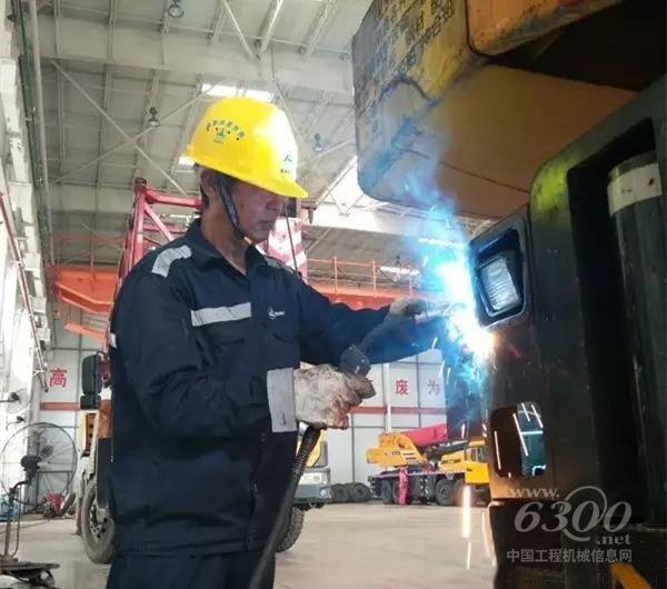 接下来季师傅要做的是,把用余料压制好的“补吧”扣在缺口上定位、校正。这个工作最关键的工序是焊接,可以想象一个25吨五节臂的内部空间是多么的狭小,体型稍大一点的人都进不去,季师傅表情严肃地把自己包裹好,在别人的帮助下一点一点的爬了进去,硬是把三米多长的接缝焊好,并且打磨平整。当焊完里面,我们把他拖出来时,他就像刚被从水里捞出来似的,瘫坐在地上。歇息了一会,他换了件干工作服定了定神,又继续修复外部,终于用了7个小时把臂修好了。