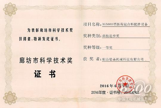 近日,廊坊市科技局发布通知:经廊坊市科学技术进步奖评审委员会评审,2016年科学技术进步奖共授奖73项,其中一等奖5项,二等奖22项,三等奖46项。德基机械在众多参评单位中拔得头筹,荣膺“廊坊市科学技术进步奖”一等奖。