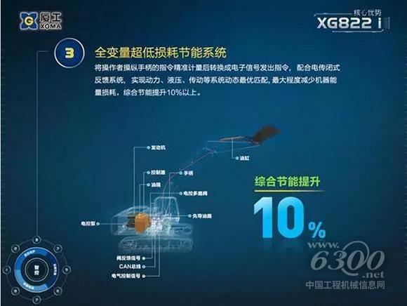 3、 全变量超低损耗节能系统:节能10%以上;具备智能“指令转换”,完成发动机、工作泵、多路阀动态最优匹配,最大程度减少能量损耗,实现绿色作业。