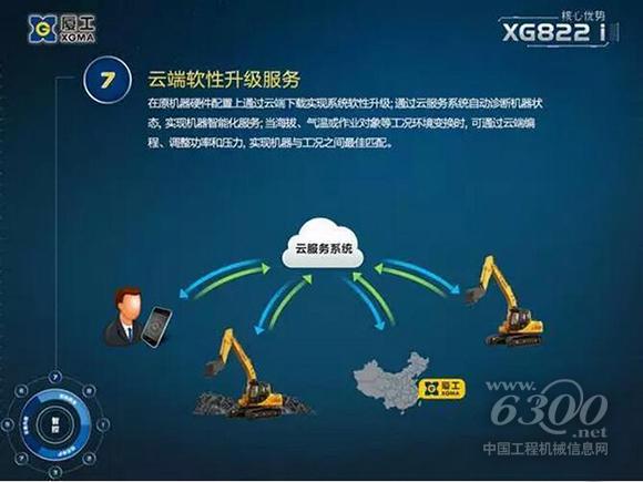 7、 云端软性升级服务:通过云端服务,远程诊断,智能下载,实现系统软性升级,轻松享有智能化服务;通过云端编程调整功率和压力,实现智能挖掘机与工况需求之间的最佳匹配。