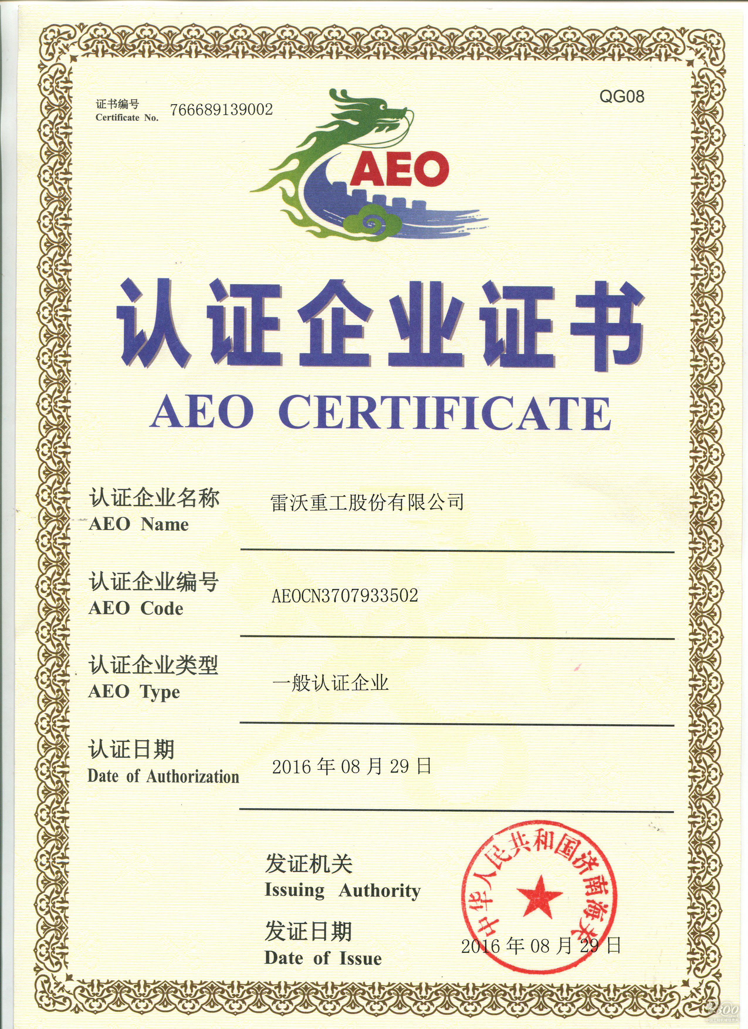 早在2014年8月6日,雷沃重工国际贸易公司成功获得海关“AA类企业”称号,“AA类企业”是海关管理中最高信用等级的企业,是海关授予进出口企业的最高荣誉。2016年5月份,雷沃重工开始提交申请材料,积极申请认证AEO认证企业。之后海关按照相关《企业认证标准》,经涉及内部控制、财务状况、守法规范、贸易安全及附加标准等五方面共29项内容的严格稽查验证,初步认定雷沃重工整体企业信用高,符合各项标准条件,并将此审查结果上报海关总署,海关总署核准了此审查结果。在8月底,济南海关向雷沃重工颁发《AEO认证企业证书》,雷沃重工正式成为海关AEO“一般认证企业”。