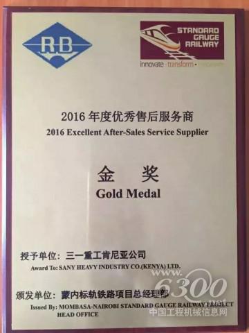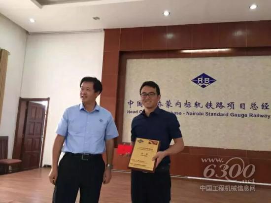 近日,三一重工北非大区的肯尼亚子公司荣获了由蒙内铁路项目总经理部颁发的“2016年度优秀售后服务商金奖”,肯尼亚子公司服务经理王龙作为代表上台领奖。