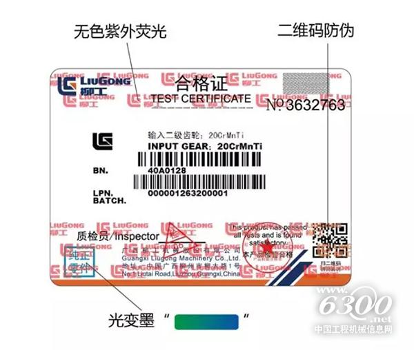 我们一起来看看如何通过防伪标贴辨真伪。下图即为柳工配件最新防伪标贴, 使用了光变墨、无色紫外荧光、二维码等三种防伪技术以进一步提高仿制难度: