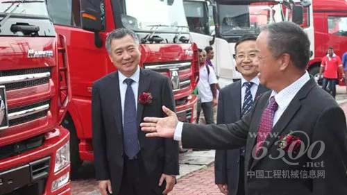 徐工汽车事业部总经理罗东海(左)、进出口公司副总经理扈向阳(中)向客户介绍漢風系列卡车​