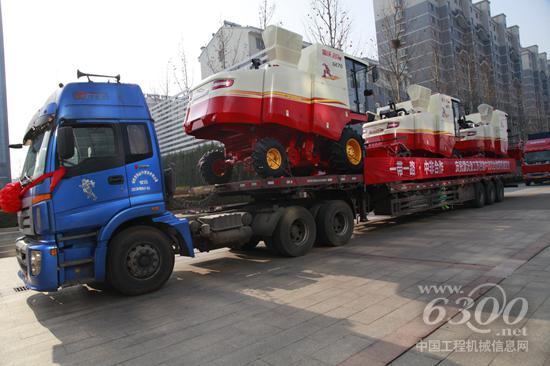 满载雷沃收割机的物流运输车驶出雷沃重工厂区